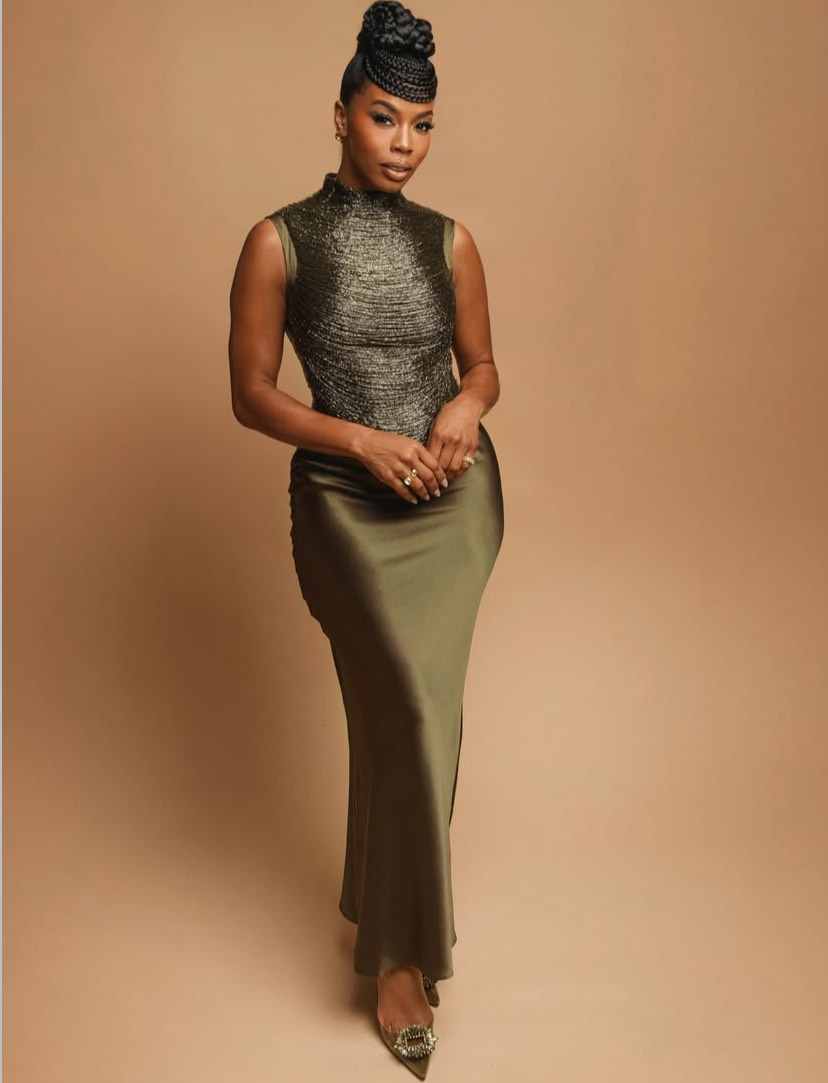 Brandee Evans glowed in an olive metallic top and flowing satin skirt by Cult Gaia. The earthy tone and subtle sheen gave the outfit grounded richness, while embellished heels and delicate rings added polished charm.