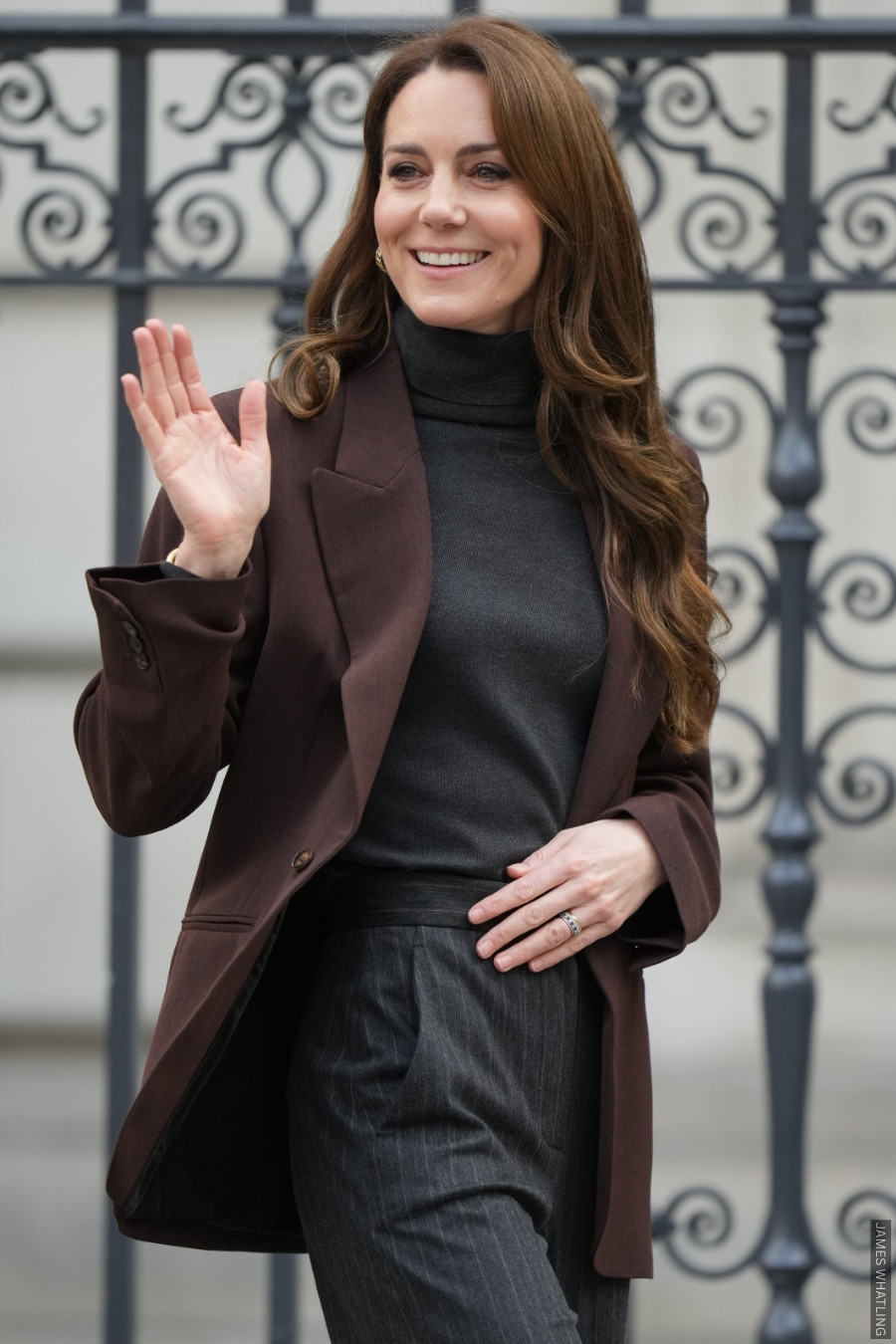 For an engagement at the National Portrait Gallery earlier this year, the Princess wore a brown blazer over a grey rollneck, finishing the look with pinstripe trousers and pointed black shoes.