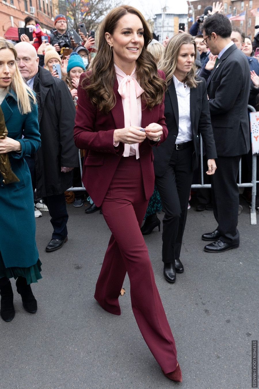It’s often tricky to know what pairs well with burgundy, especially when it’s the dominant colour in your outfit. Kate solved the dilemma during the 2022 Earthshot trip to Boston, wearing a blush pussy-bow blouse beneath her burgundy Roland Mouret suit: