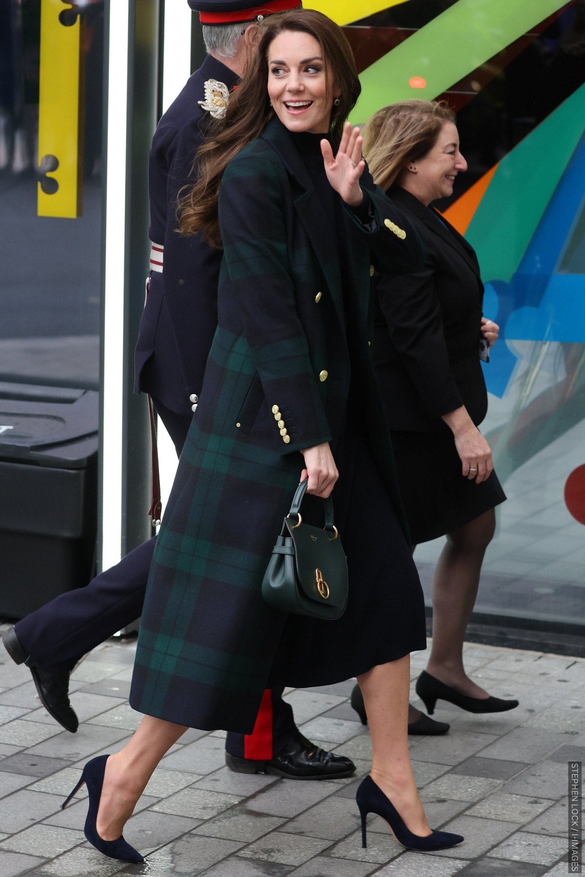 She paired the checked Holland Cooper coat with navy suede heels and a green Mulberry handbag. I love how the gold accents in the bag’s hardware echo the buttons on her coat—a small detail that ties the whole look together.