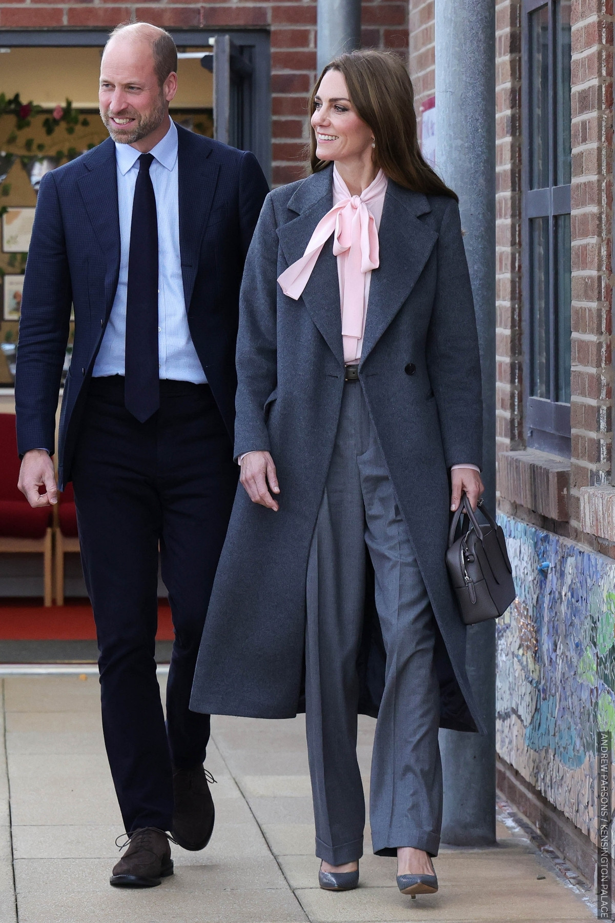 Kate rewore the rose-pink blouse recently; this time pairing it with grey trousers and a coat in the same shade.