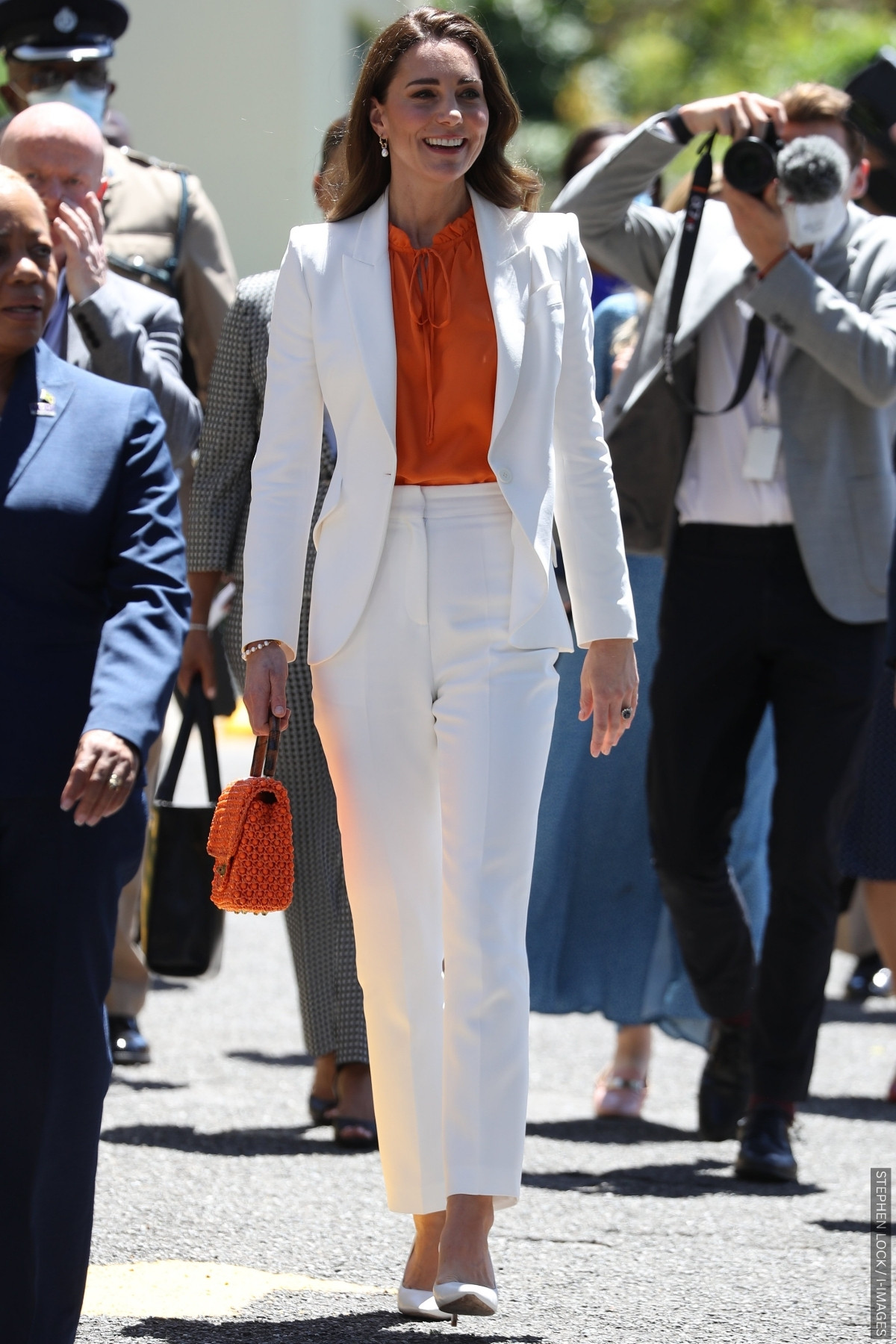 Kate brought a burst of sunshine to Jamaica in 2022 with this eye-catching orange Ridley London blouse. She paired it with a crisp white Alexander McQueen suit and a matching orange vintage bag.