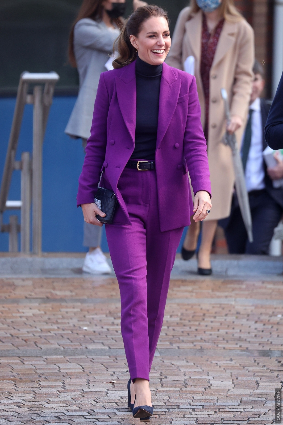Kate turned heads in a vibrant purple Emilia Wickstead suit in Northern Ireland in 2021. She layered the blazer over a navy turtleneck and completed the look with navy pumps—a daring yet refined colour clash that felt both regal and modern.