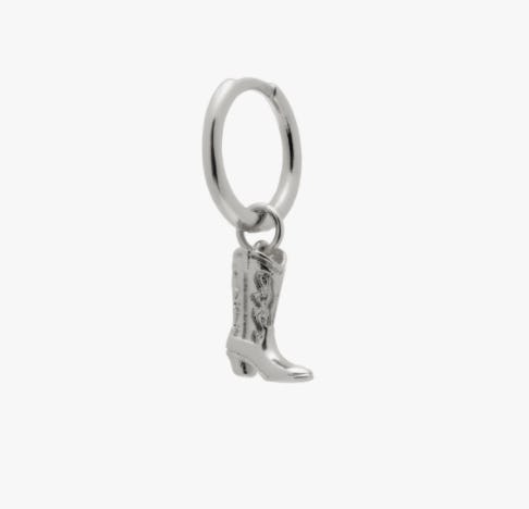 The trendy jewelry gift is this western boot charm hanging on a simple, silver huggie.