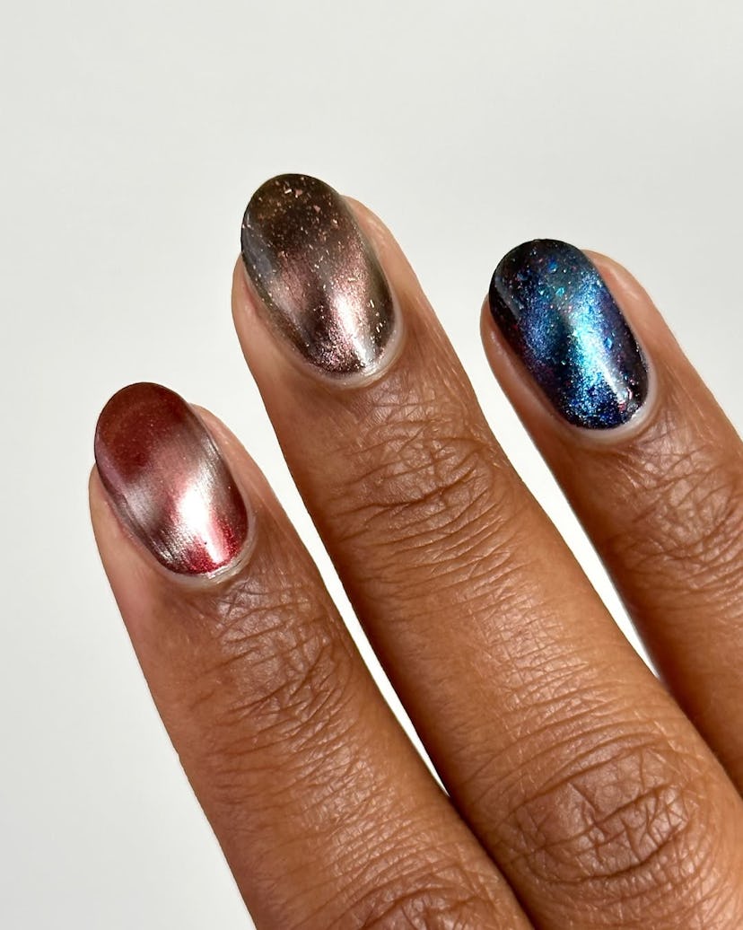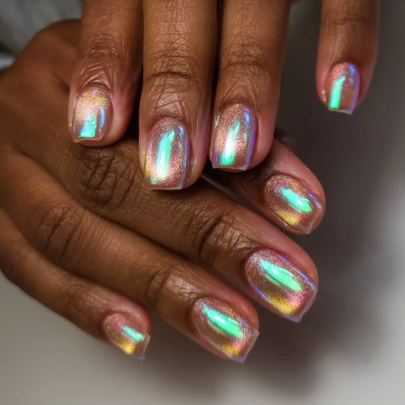 This manicure melds chrome with cat-eye for an eye-catching multi-dimensional effect.