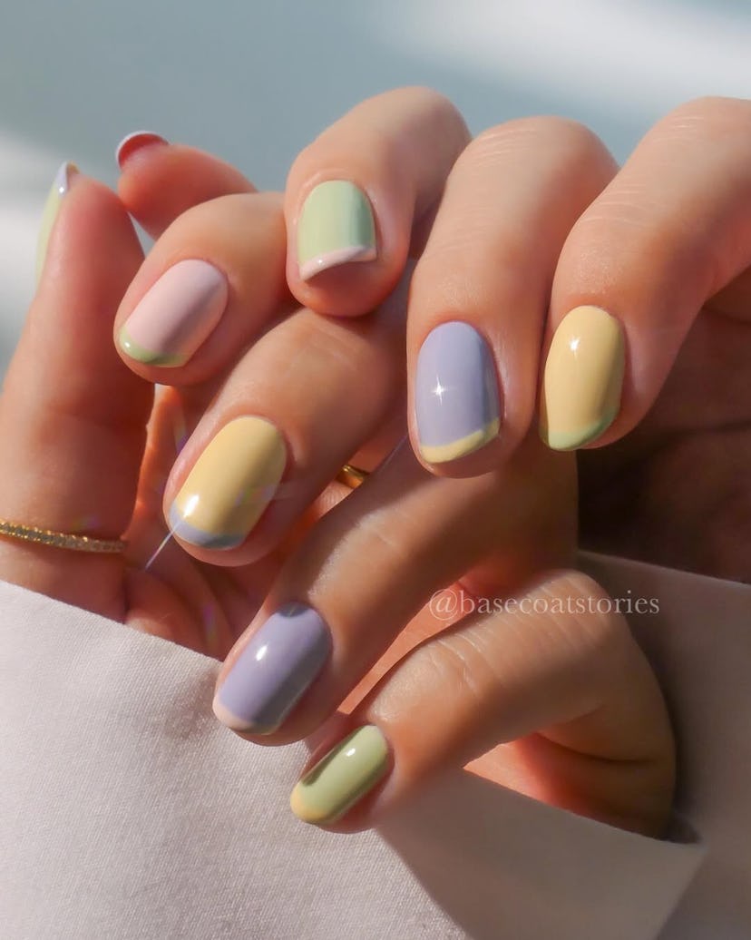 French manicures featuring all-over color are soft and sweet when executed in pastels.