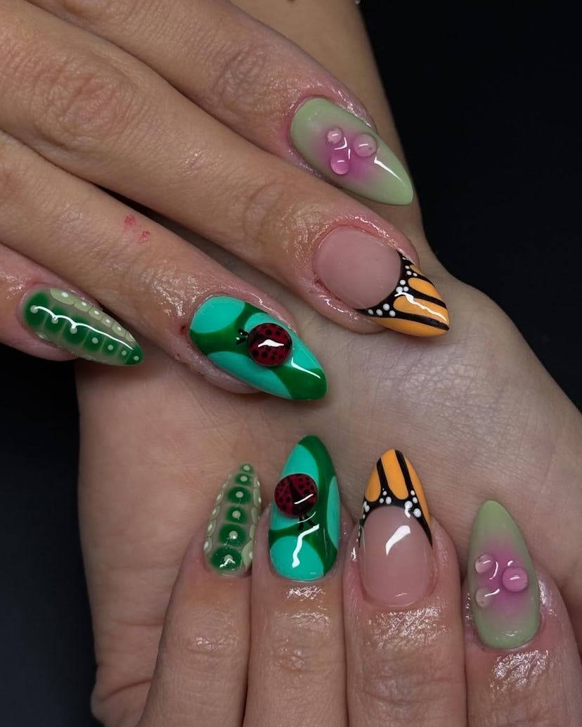 Who knew an insect infestation could be so cool? Expect your loved ones to bug out over the medley of bug-inspired patterns and textures featured in this exaggerated mani.