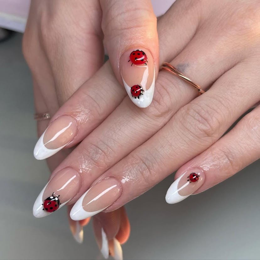These 3D insects, positioned atop a classic french manicure, are cute, unexpected, and true to size.