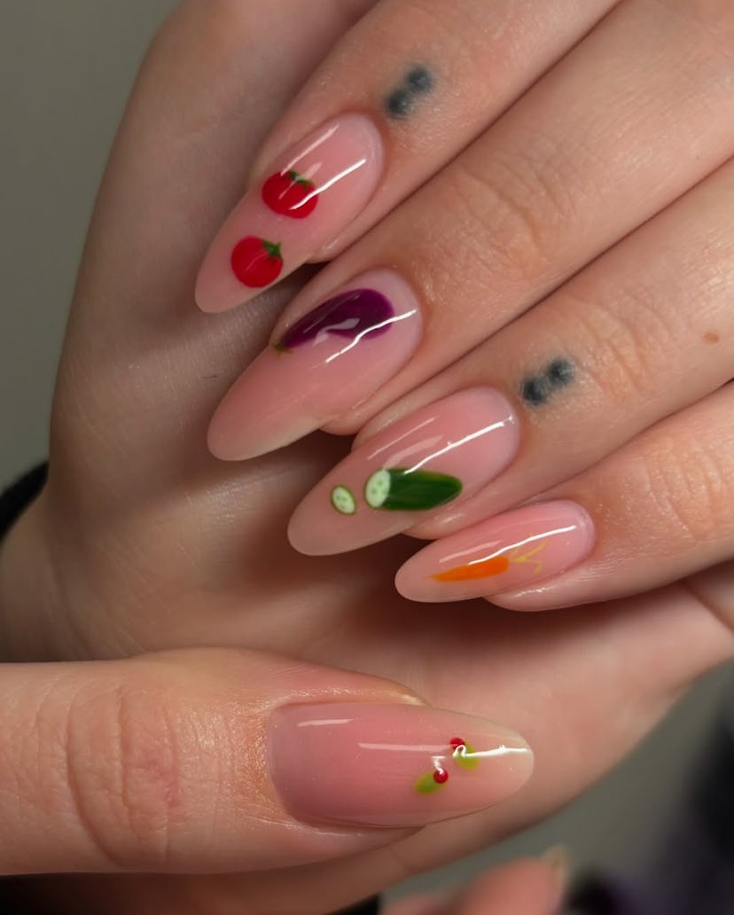 Summer’s edible abundance doubles as unique nail art. Celebrate how your garden grows with a veggie-inspired mani, which is more chic than cutesy on an almond-shaped nail.