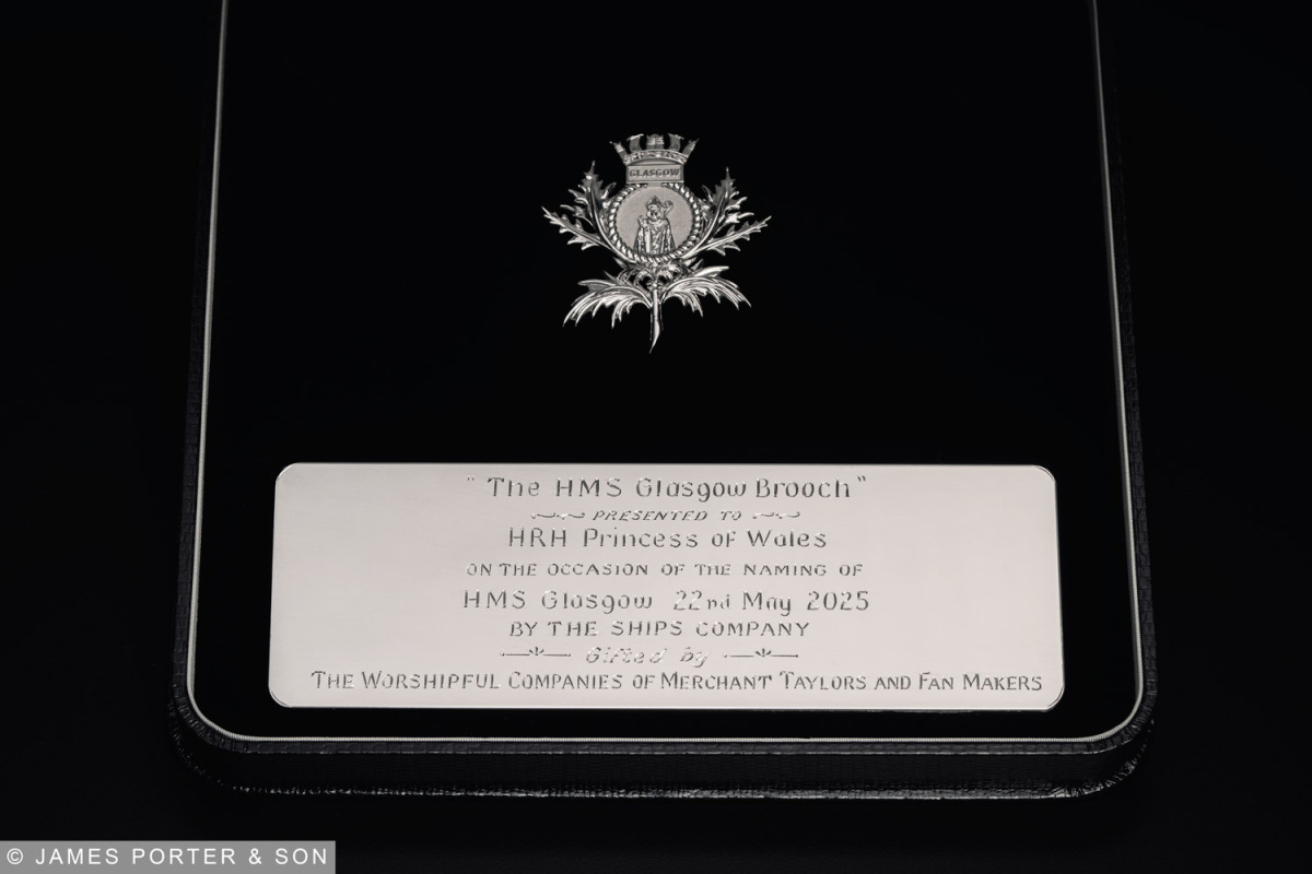 Crafted in sterling silver and hallmarked in Edinburgh, the brooch’s design merges tradition with symbolism. At its heart sits a finely detailed depiction of St Kentigern, Glasgow’s patron saint, framed by the curved leaves and spiked form of a thistle, the Scottish emblem. The thistle’s bloom is replaced by a crown—a subtle nod to royal heritage. The silhouette is designed to echo the strength and elegance of HMS Glasgow’s crest: