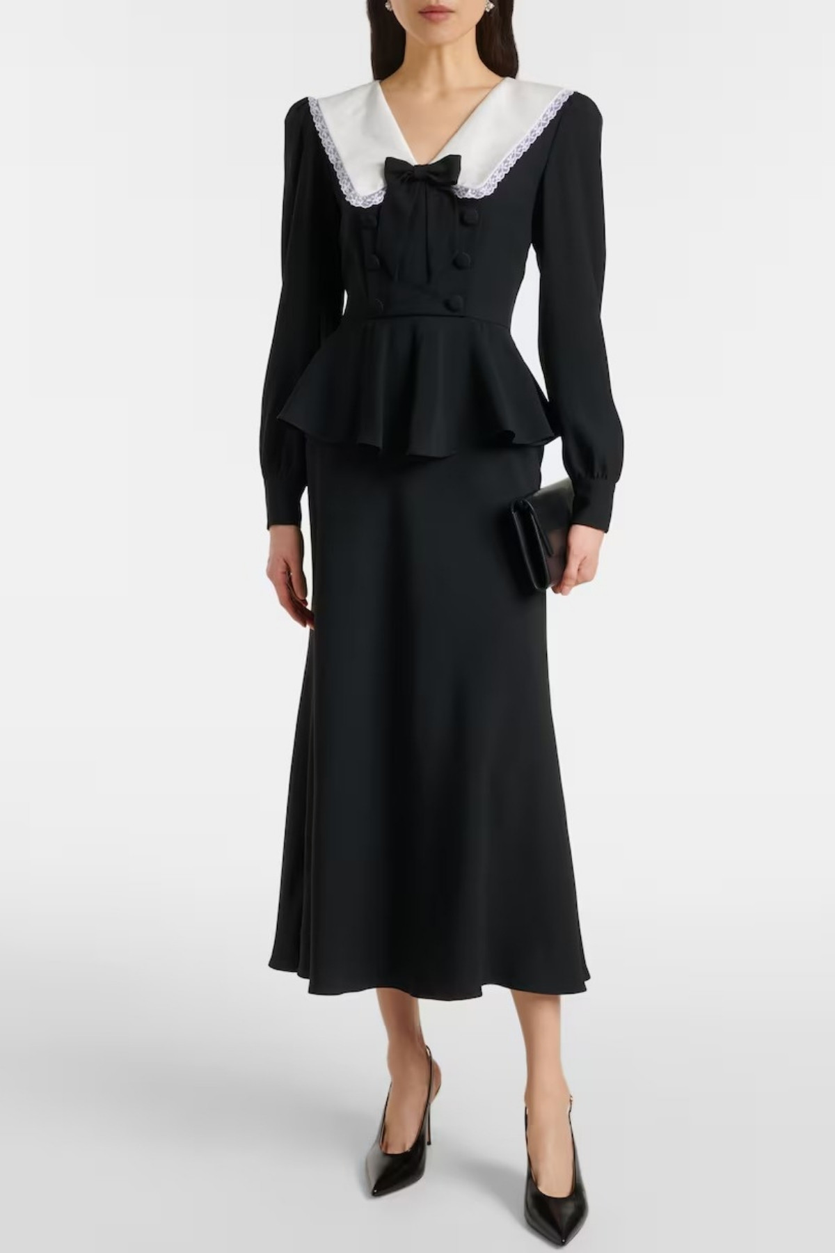 Kate wears the designer’s ‘Envers Dress‘, a long black dress that features a crisp white lace-trimmed collar, decorative bow at the neckline and a structured peplum waist.