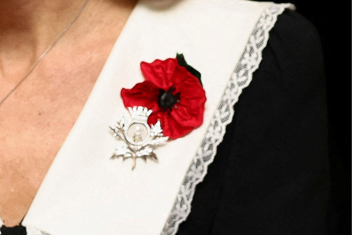 On the white collar of her dress, the Princess pinned a handcrafted silk poppy, designed by Izzy Ager for Lock & Co. The piece is created from glass, silk and natural fibres.