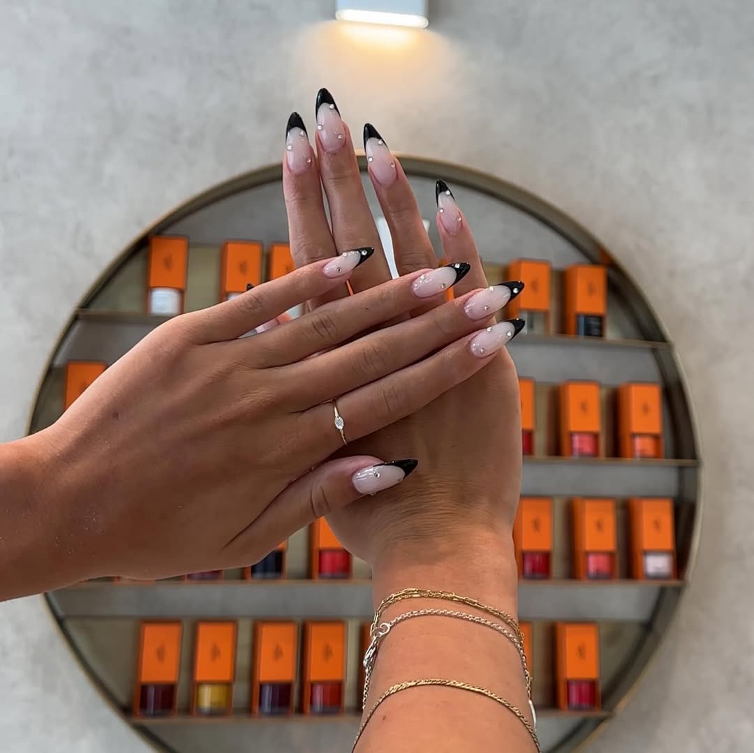 A straightforward black French tip is the easiest way to introduce edge into your holiday beauty routine. The clean strip of black outlines the nails, adding structure without overpowering your outfit. It’s a great choice for Thanksgiving dinner, especially if you’re wearing warm tones, denim, or a monochrome look. Ask for a crisp micro-line for subtlety or a thicker arc for more impact, as both deliver the confident finish beauty lovers want.