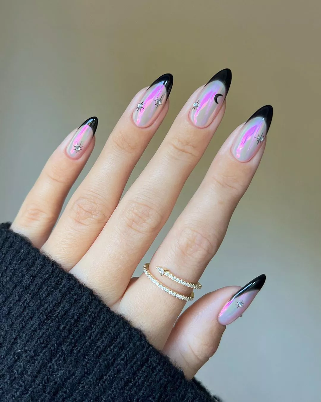 Rhinestones and pearls are among this year’s biggest nail accents. Adding a tiny pearl or rhinestone near the cuticle or tip gives the manicure a festive, refined touch. It’s especially fitting for winter weddings, holiday galas, or any event where you want to elevate the classic French tip. The embellishments add lightness without diminishing the black’s visual power.