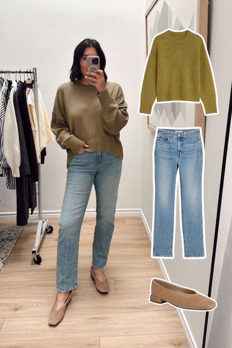 So this sweater is temporarily offline…and I’m not quite sure why. I have my guesses — I’m thinking they are restocking for next week (Black Friday!) but maybe it really did just sell all the way out. I will keep an eye on it, but I am linking the exact one here. It is called the “100% Cotton Boyfriend Crew Sweater” and this is the Herbed Green hue.