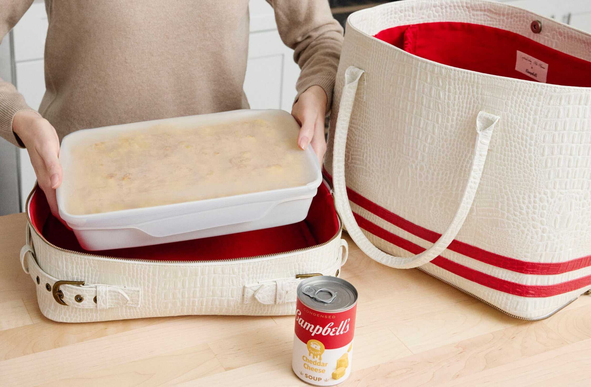 Kit: We can riff forever. When we started with this opportunity, we had a million ideas. That’s where the Campbell’s team was so helpful, being like, “This is something that could work really well for our audience.” We worked together to pick every aspect of both of the bags. That process was really fun, because you start with all of these crazy, out-of-this-world ideas, and then it’s about bringing that product to life. Especially with these bags, you really have to meld fashion and function. We did a lot of testing to make sure that the bags were actually functional, able to carry ice, drinks, casserole dishes, all of that. They look great, and you want to walk down the street wearing them, but you also have to think about, “How is this going to function in someone’s life? How are they going to be able to bring their favorite sides and their favorite drinks to a party?”
