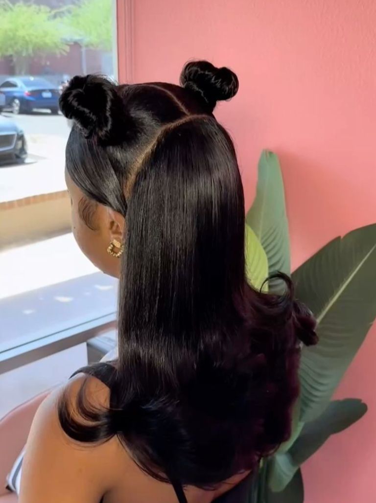 The half-up variation brings the spirit of space buns into a gentler, more romantic direction. Here, only the top half of the hair is gathered into two small buns, allowing the rest to cascade freely.