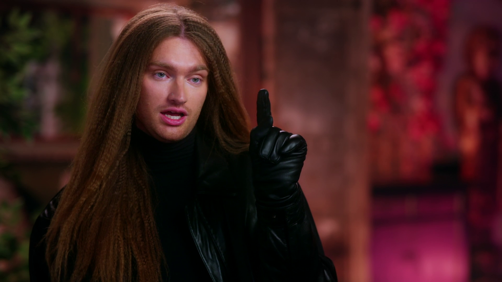 Her daytime drag served as a funny foil to Venus this episode. She’s the dark and stormy demon to his angelic light — here she is with basically the same hair and t-shirt as Venus when he sat on Kim’s couch, except in all black. The nameplate necklace instead of the angel numbers and loose hair tie really sell the contrast.